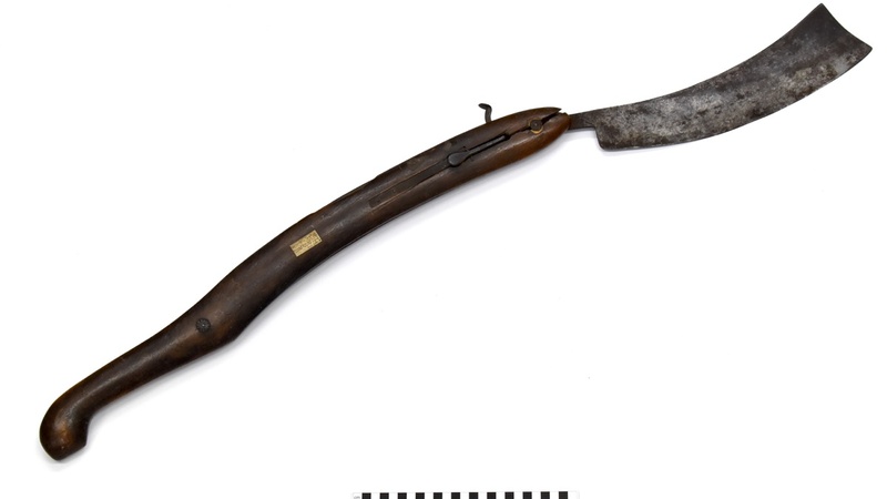 Here is a bladed weapon, with a wide sharp blade that slides out of a slot in its long wooden hand-carved handle.