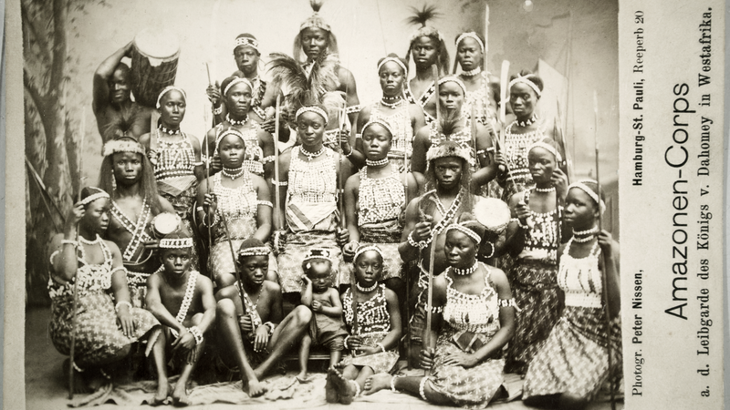 Here is a photograph of a group of women from the Dahomey region with a caption that says “Amazonen-Corps a.d.Leibgarde des Konigs v. Dahomey in west Afrika”. This photograph was made in Dahomey, West Africa.